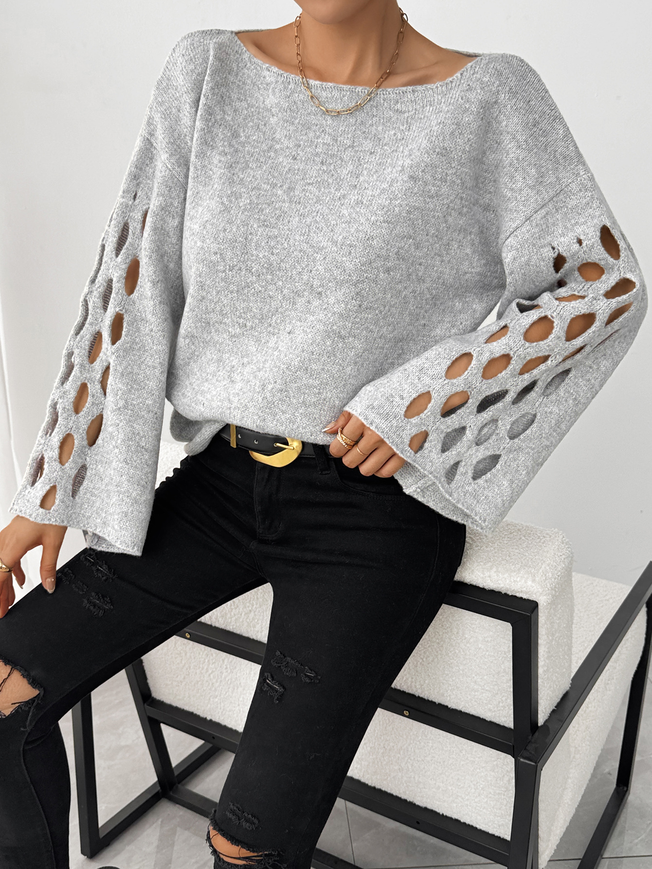 Pull creux à manches longues et col rond pour femme, couleur unie