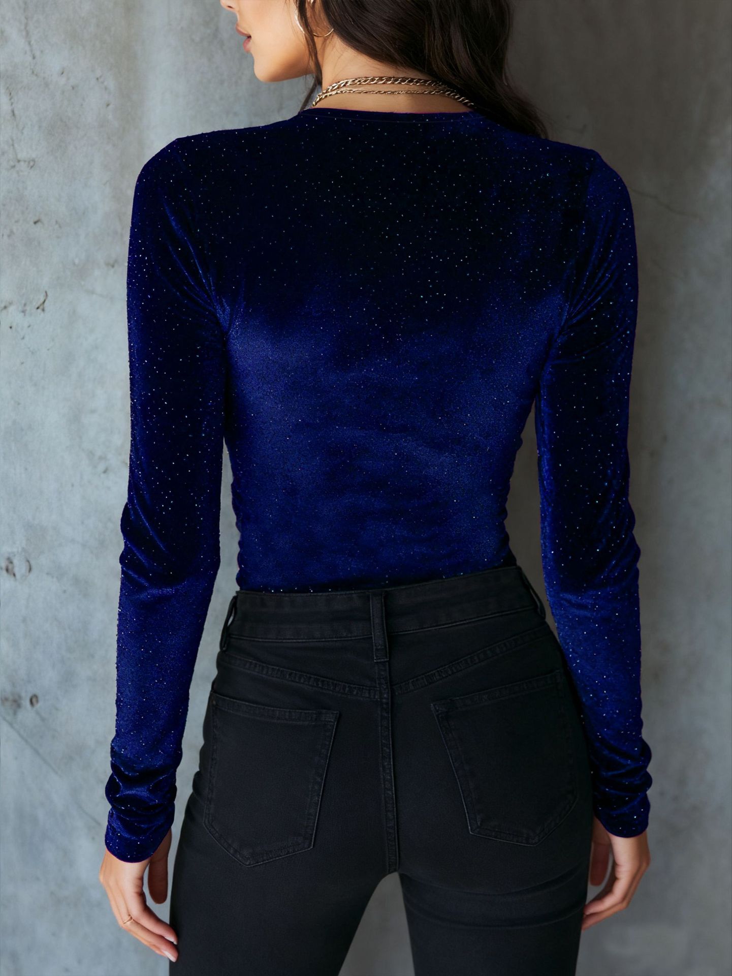 T-shirt à manches longues en velours à sequins unis pour femme, coupe ajustée, col en V